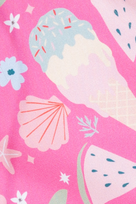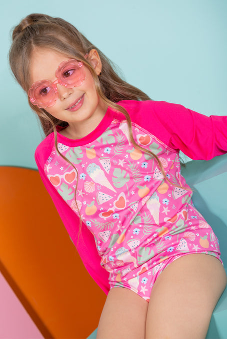 Este encantador vestido de baño para niña combina un colorido estampado de frutas y helados, perfecto para un estilo dulce y refrescante.